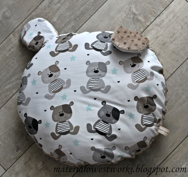 Jaka piękna podusia :) Nie widziałam takiej wcześniej. Materiały świetnie pasują do siebie, a misie są takie urocze :)