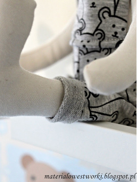 Dwie poprzednie maskotki uszyłam z białego polarku, natomiast teraz użyłam grubej surówki bawełnianej. Musze przyznać, iż szyje się z tej tkaniny znakomicie. Po wypchaniu ciałka królika, szwy się nie rozchodzą, a całość świetnie się trzyma.